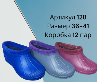 Галоши  женские утепленные эва (р-р 36-41).Страна производства - Россия. Размерный ряд с 30 по 36. В упаковке 12 пар. Цвет - в ассортименте. Товар сертифицирован.