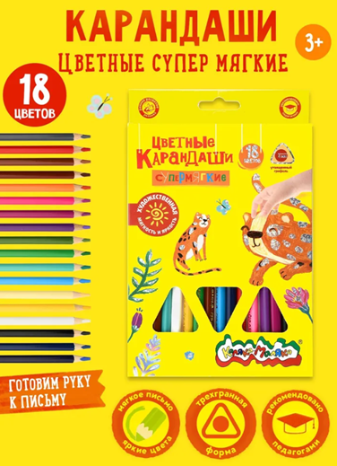 —Карандаши цветные супер мягкие для рисования детские Каляка-Маляка Премиум, набор 18 цветов