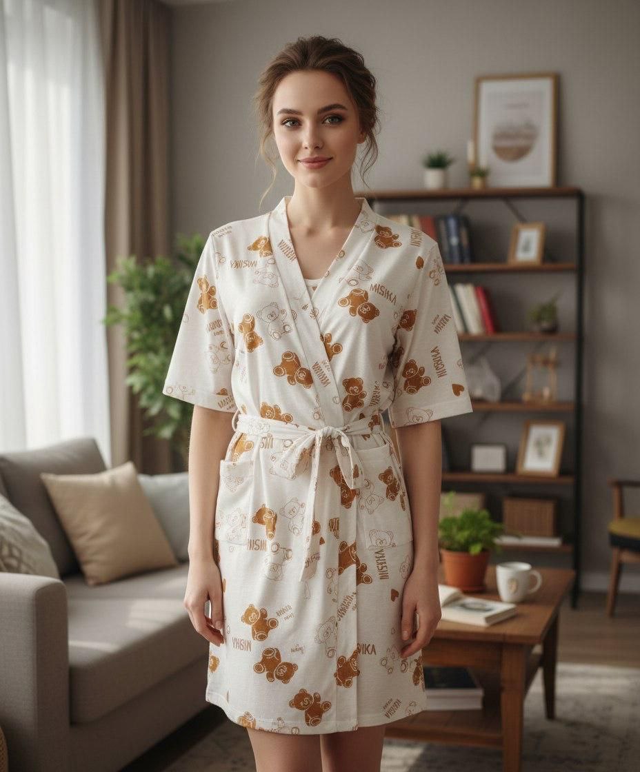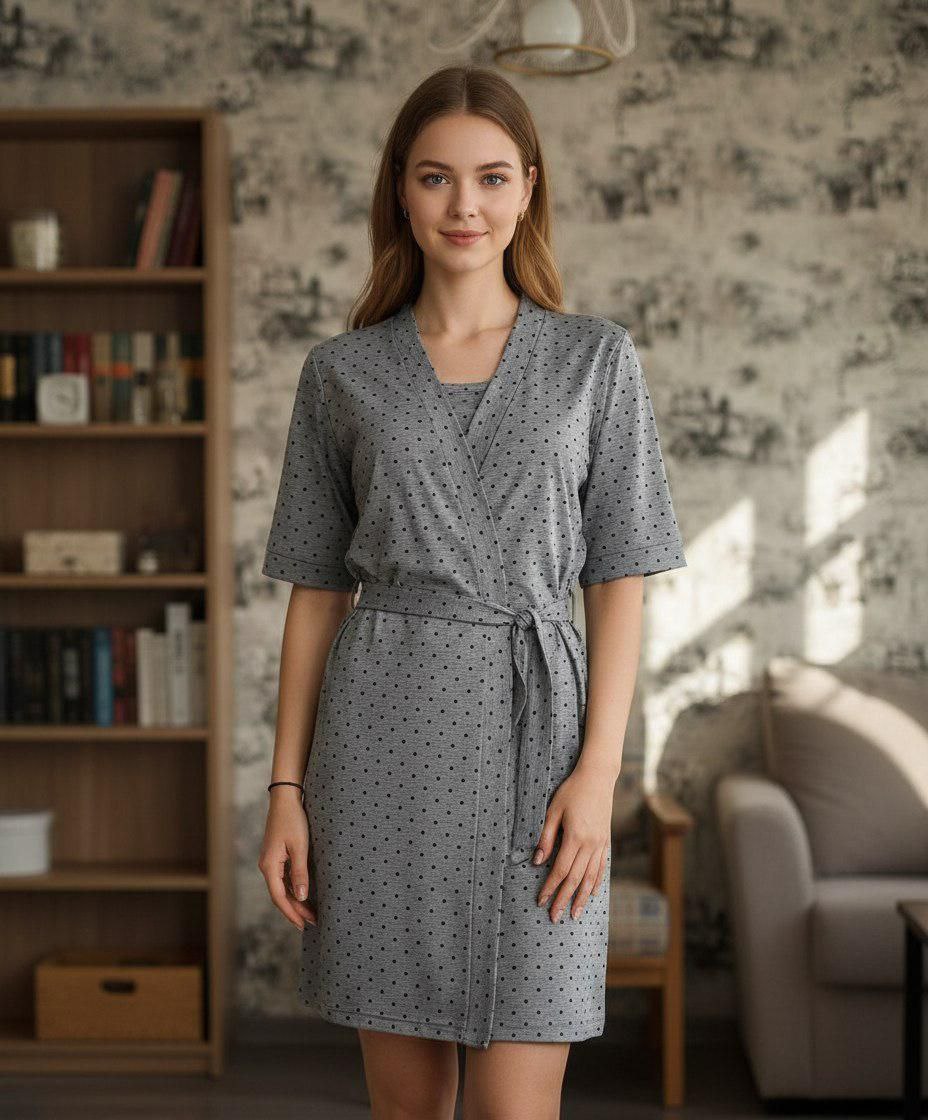 Свободный крой не сковывает движений, а легкая, дышащая ткань обеспечит вам комфорт в любое время суток. В комплекте идет стильный халат, который можно носить как дома, так и в роддоме. Он прекрасно дополнит образ и создаст ощущение уюта.