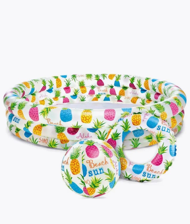 Бассейн на 248 л состоит из трех колец. В комплект входит надувной мяч 51см., и надувной круг диаметр 51см. Дно не надувное. Насос в комплект не входит.