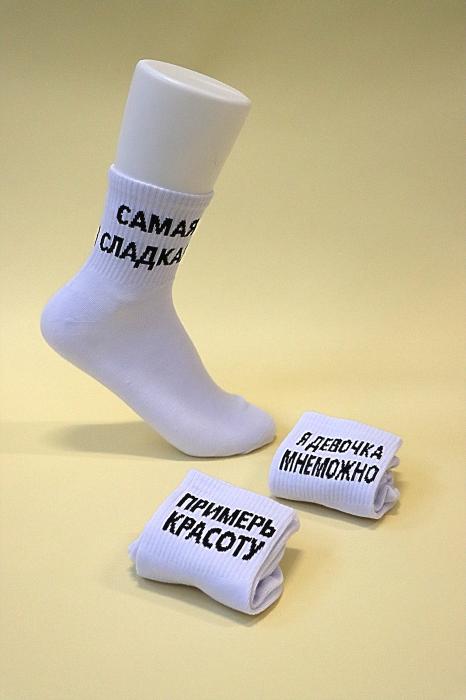 Носки женские высокие, белые. Слоган. Р-р 36-41. Страна производства - Россия. Товар сертифицирован.