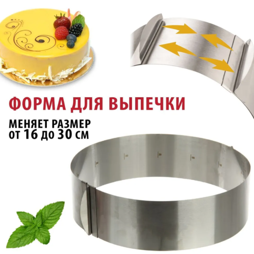 Кулинарное кольцо из нержавеющей стали может изменять диаметр от 16 до 30 см., есть мерные шкалы на внутренней стороне. Кондитерское кольцо не занимает много места на кухне, легко моется в посудомоечной машине. Кондитерский инвентарь заменит целый ряд статичных форм. Форма для салатов, кексов, тортов, пирогов. Это прекрасное приобретение в дом, дополнит кухонные принадлежности и инструменты.