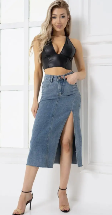 Юбка джинсовая миди с разрезом сбоку, длина 88см.Размерный ряд 42-50.Количество в упаковке 5шт.Страна производства - Россия. Товар сертифицирован.
