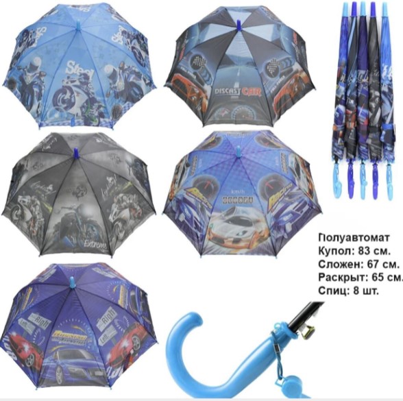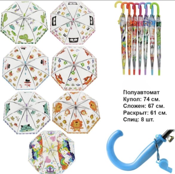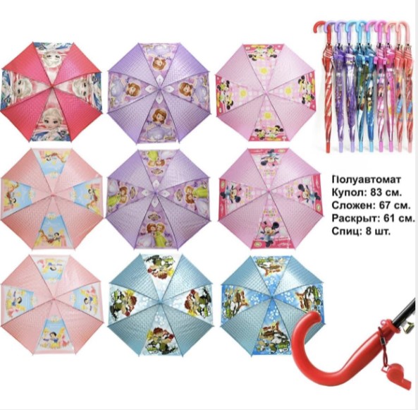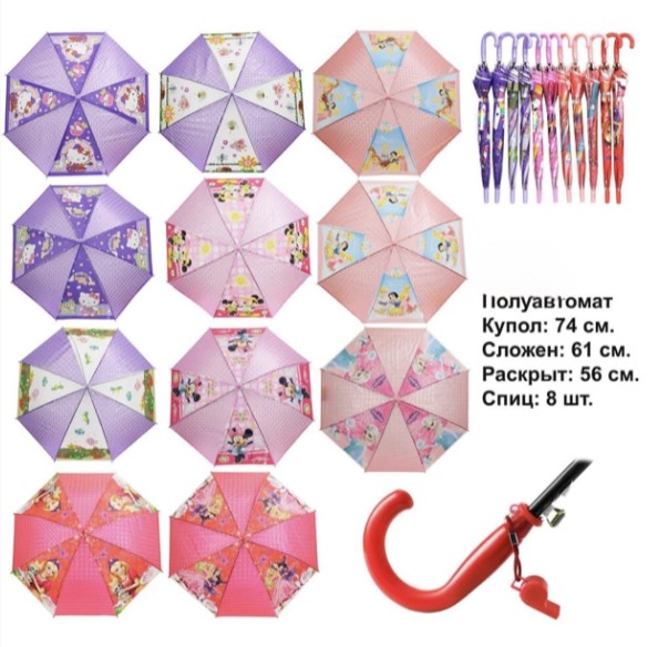 Зонт для мальчика и девочки со свистком ( 8 спиц) в упаковке 5 шт разных принтов и рисунков товар сертифицирован производство Россия